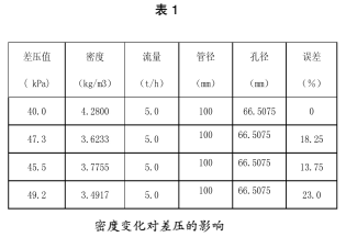 通過上面的數(shù)據(jù)可以看出,當(dāng)流量不變時(shí),密度發(fā)生18.4%的變化時(shí),將直接導(dǎo)致差壓23%的變化。差壓的誤差*終導(dǎo)致流量測(cè)量的誤差。