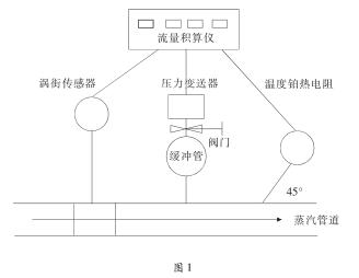 蒸汽作為重要的二次能源廣泛應(yīng)用于工業(yè)生產(chǎn)當(dāng)中。蒸汽的計(jì)量是蒸汽使用過(guò)程中重要的一環(huán),蒸汽流量計(jì)的準(zhǔn)確性關(guān)系到供、用雙方的經(jīng)濟(jì)利益。蒸汽流量計(jì)又是由多個(gè)計(jì)量器具組成的一個(gè)計(jì)量系統(tǒng)。而蒸汽流量計(jì)大都安裝在高溫、高壓的蒸汽管道上,不方便拆卸,如何提高蒸汽流量計(jì)現(xiàn)場(chǎng)檢測(cè)技術(shù)就變得非常重要。目前常見(jiàn)的用于計(jì)量蒸汽的流量計(jì)一般有兩種:渦街流量計(jì)和差壓式流量計(jì)。渦街流量計(jì)主要由渦街流量傳感器、流量積算儀、壓力變送器、溫度鉑熱電阻組成。差壓式流量計(jì)主要由標(biāo)準(zhǔn)孔板、差壓變送器、流量積算儀、壓力變送器、溫度鉑熱電阻等組成。渦街流量計(jì)由于其結(jié)構(gòu)簡(jiǎn)單、牢固、安裝維護(hù)方便。目前在市場(chǎng)上的應(yīng)用越來(lái)越廣泛。渦街流量計(jì)安裝示意圖如圖1: