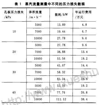 表1的數(shù)據(jù)為蒸氣流量測量中不同的壓力損失,孔板流量計引起的額外耗電量、電耗費用、其中運行天數(shù)按360d計算,電價按0.4元/kW·h計算,