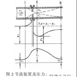 圖1表示在節(jié)流裝置前后截面Ⅰ、Ⅱ及Ⅲ處流體壓力與速度的分布情況。流體在到達(dá)截面Ⅰ之前,以一定的流速v1流動(dòng),此時(shí)靜壓力為p1。在接近節(jié)流裝置時(shí),由于遇到節(jié)流裝置的阻礙,使靠近管壁處的流體受到節(jié)流裝置的阻擋作用,使部分動(dòng)能轉(zhuǎn)化為靜壓能,使得節(jié)流裝置入口端面靠近管壁處的流體靜壓力升高,并且遠(yuǎn)大于管徑中心處的壓力,因此節(jié)流裝置入口端面處產(chǎn)生一徑向壓差。