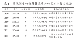 目前,國內(nèi)*三方標定僅有開封**水大流量計量站能標定口徑達1.6m的大管徑蒸汽流量計,可以提供1.6m及以下全口徑檢定**。部分用于蒸汽測量的西斯特流量計的*三方檢定數(shù)據(jù)如表1所示。