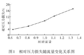 從表1中可以看出,設(shè)計(jì)點(diǎn)進(jìn)口壓力相對(duì)損失近10%,*小點(diǎn)近3%,*大點(diǎn)近18%,隨流量的增加相對(duì)壓力損失變化如圖1所示。