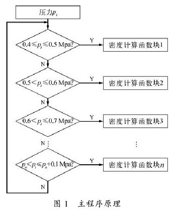 定義密度計(jì)算程序是蒸汽壓力0.4~0.5MPa的一個(gè)函數(shù),以相同的方法定義0.5~0.6MPa,0.6~0.7MPa,一直到0.9~1MPa等若干個(gè)函數(shù),這里不再重復(fù)。通過對(duì)壓力值范圍的判斷調(diào)用相應(yīng)的函數(shù),就可以得到較為準(zhǔn)確的密度值。程序框圖如圖1,圖2所示,pi為蒸汽壓力,ti為蒸汽溫度。