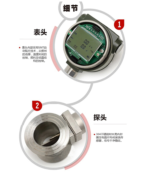 3、檢測元件不與介質(zhì)接觸,性能穩(wěn)定,使用壽命長 傳感器采用檢測探頭與旋渦發(fā)生體分開安裝,而且耐高溫的壓電晶體密封在檢測探頭內(nèi),不與被測介質(zhì)接觸,所以渦街流量計具有結(jié)構(gòu)簡單、通用性好和穩(wěn)定性高的特點。